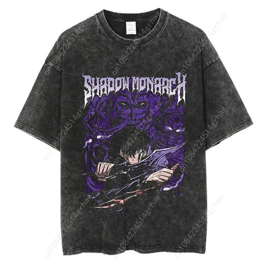 Japanese Anime Solo Leveling Print Vintage Washed Tshirt Harajuku Streetwear Graphic T-Shirt Summer Short Sleeve Cotton Tshirt