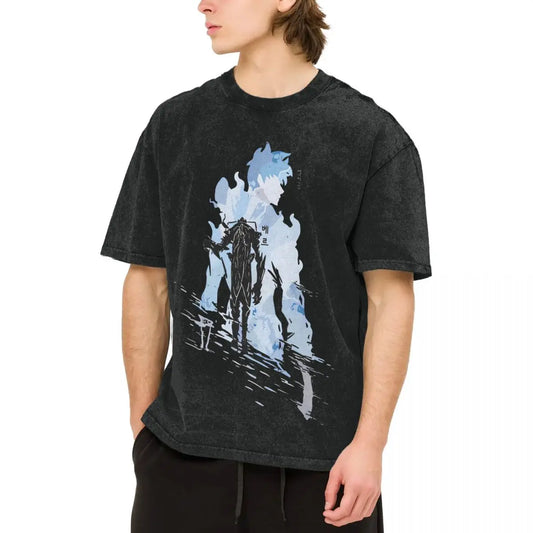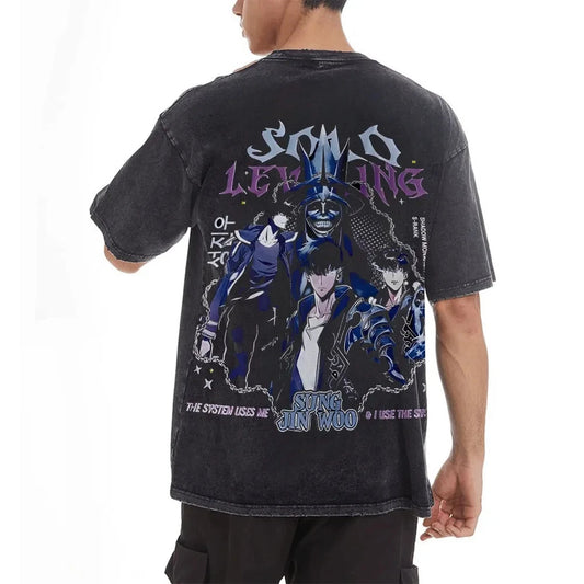 Washed Vintage Anime Solo Leveling Sung Jin Woo Double Sided Print T-shirt Men Manga Fashion Casual T Shirt Men's Oversized Tees