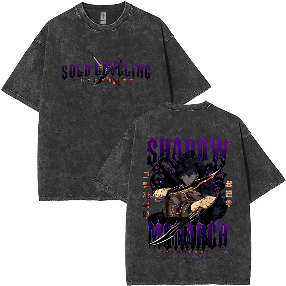 Washed Vintage Anime Solo Leveling Sung Jin Woo Double Sided Print T-shirt Men Manga Fashion Casual T Shirt Men's Oversized Tees